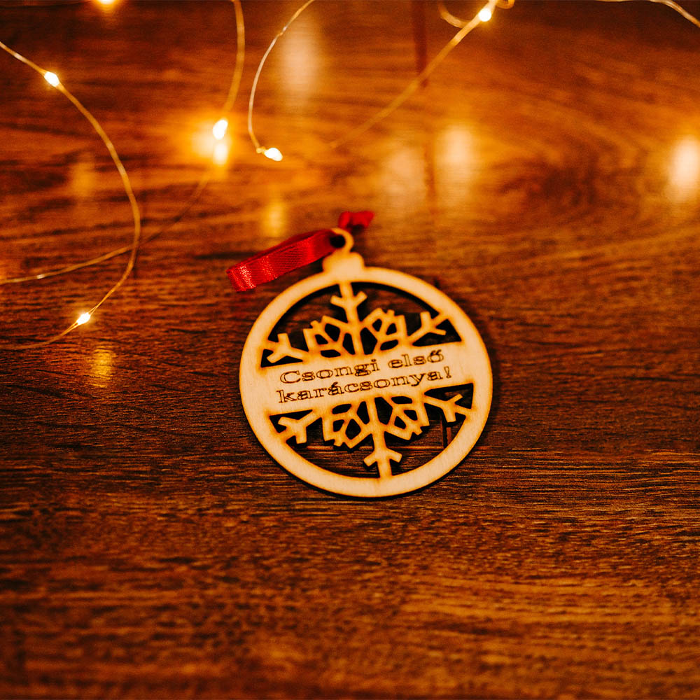 Fából készült karácsonyfadísz! Átmérője kb 7,5 cm , egyedi baba névvel ellátott kiskarácsonyi gravírozott karácsonyfadísz bármilyen felirat, név, dátum kerülhet rá, mely karácsonykor tökéletes kiegészítő ajándék a fenyőfára. Ez a kis dísz egyedivé és ünnepivé teszi az ünnepi fát.