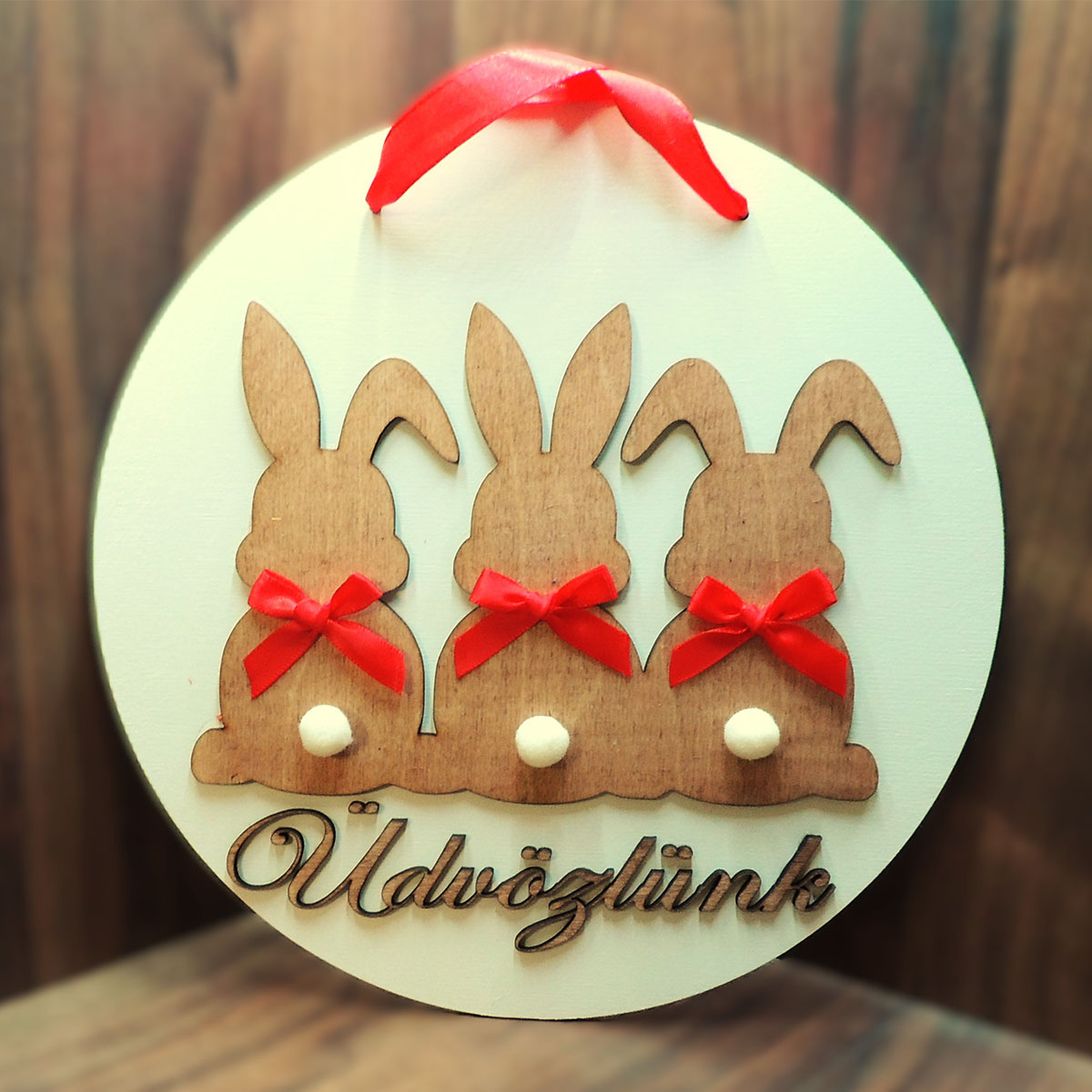 Fából készült ajtódísz húsvétra, tavaszra, ajtó kopogtató! Mérete: kb25-30 cm. Névreszólóan is kérhető.Kérlek írd meg a nevet, ha szeretnéd hogy belegravírozzuk! Ajtóra akasztható madzaggal, kilyukasztva küldjük!Húsvétkor az asztal vagy épp a fal dísze lehet! Egyedi nyuszis motívumával vonzza a tekintetet!