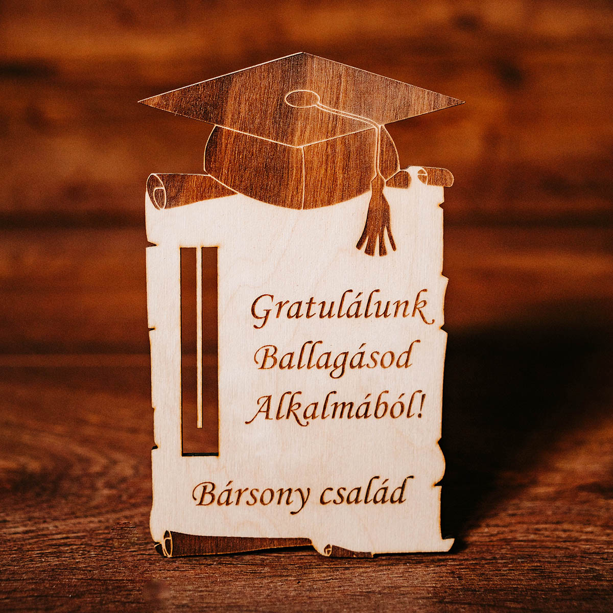Fából készült készpénzátadó! kb 10X18 cm téglalap alakú, diploma sapkás, egyedi szöveggel ellátott pénzátadó, mely bármely alkalomra tökéletes ajándék, de főképp ballagás, diplomaosztóra ajánljuk.Szöveg és felirat változtatható. A ajándékozók nevét kérlek írjátok meg, amikor rendeltek.
